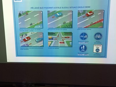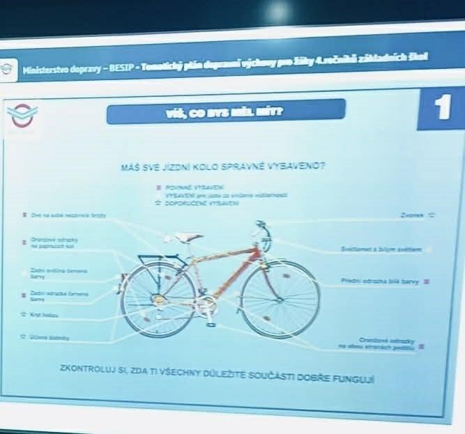 Společně jsme si zopakovali, jak se správně chovat jako chodci i cyklisté, a upozornili jsme na situace, které mohou být na silnici nebezpečné. Velká pozornost byla věnována správnému vybavení jízdního kola – dozvěděli jsme se, proč jsou důležité funkční brzdy, světla, odrazky i ochranná přilba.
