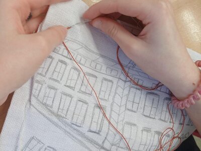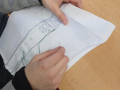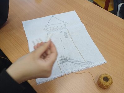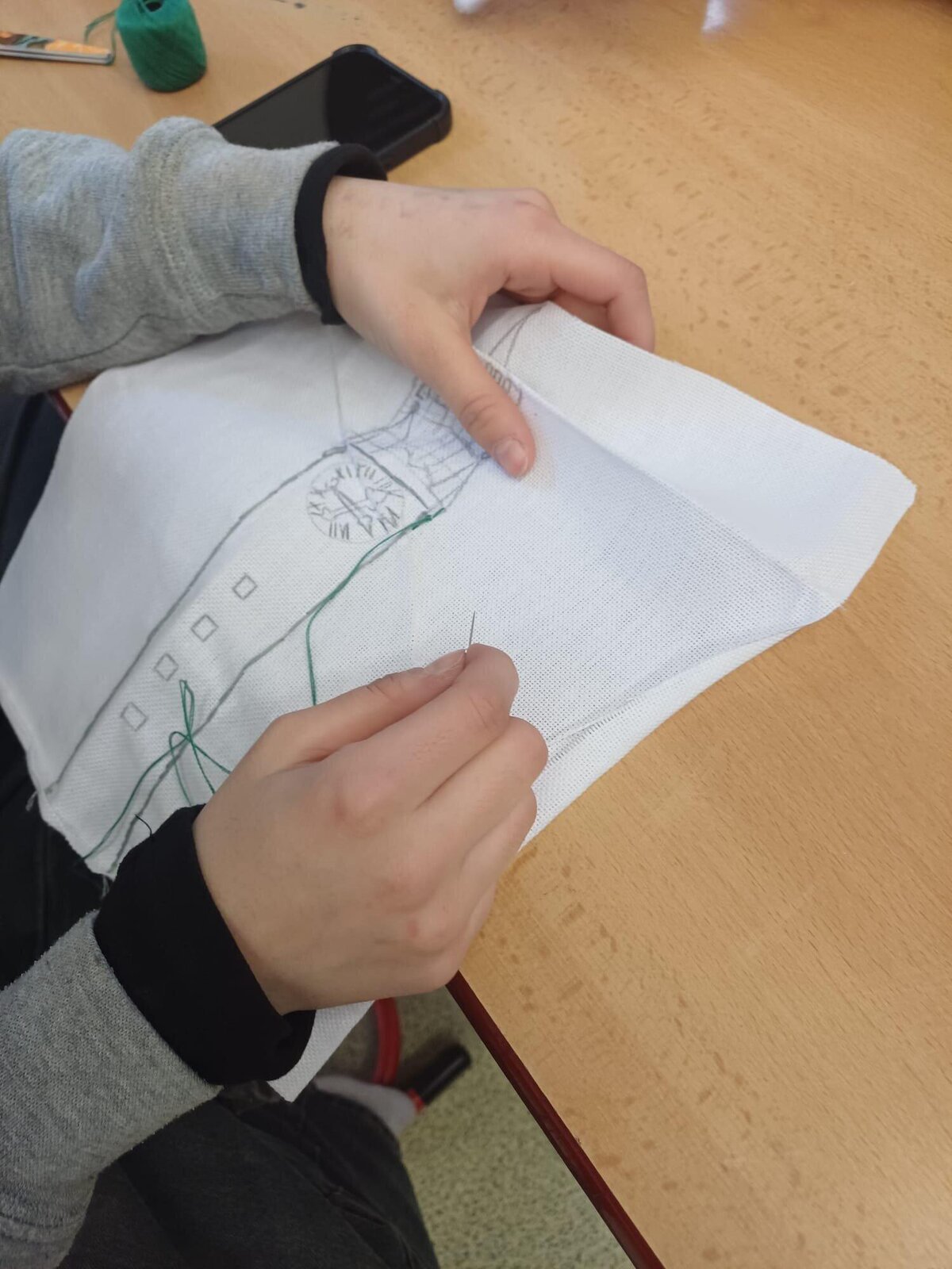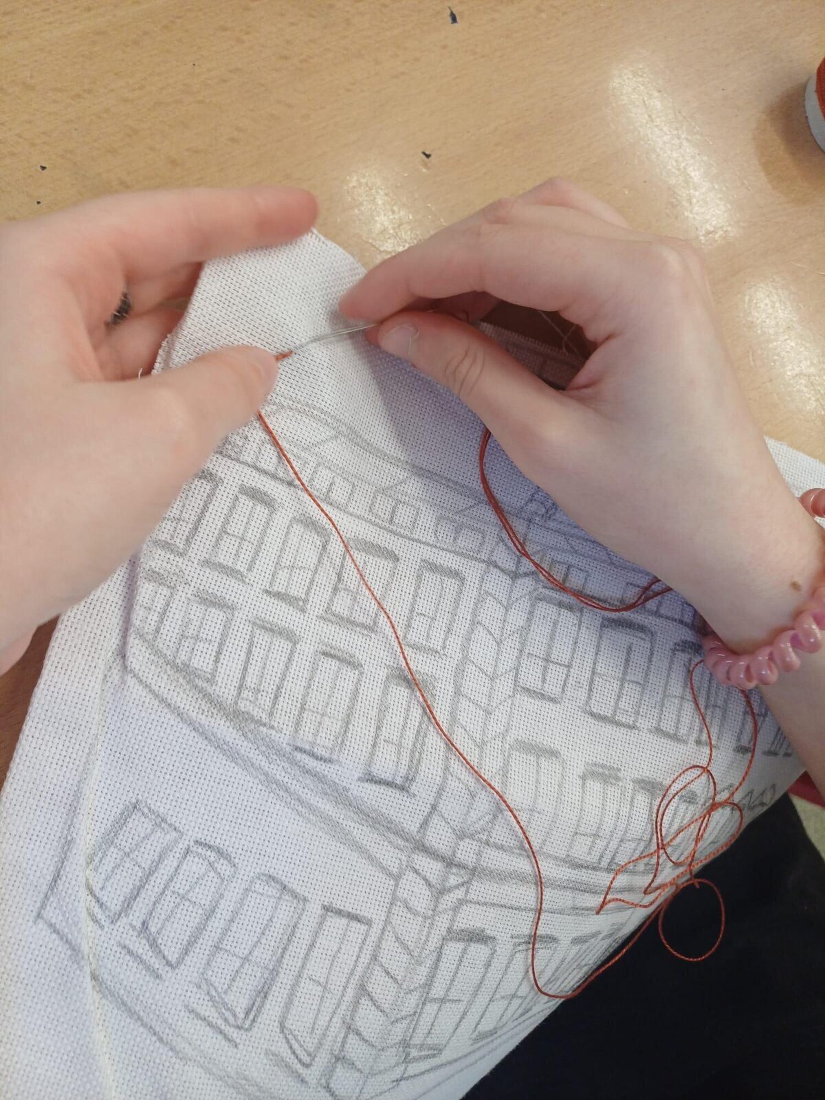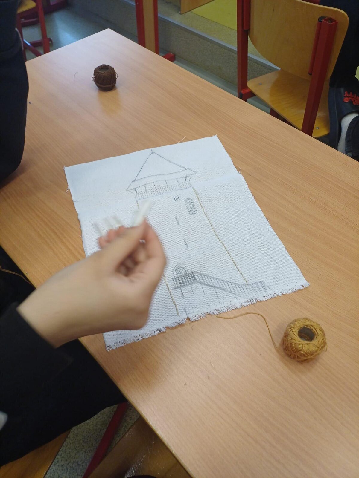 V hodinách pracovních činností se zapojujeme do příprav na výstavu k oslavě 800 let města Znojma. Žákyně vyšívají jednotlivé památky města, které si nejprve samy nakreslily na látku. Nyní své návrhy postupně převádějí pomocí výšivky do finální podoby.