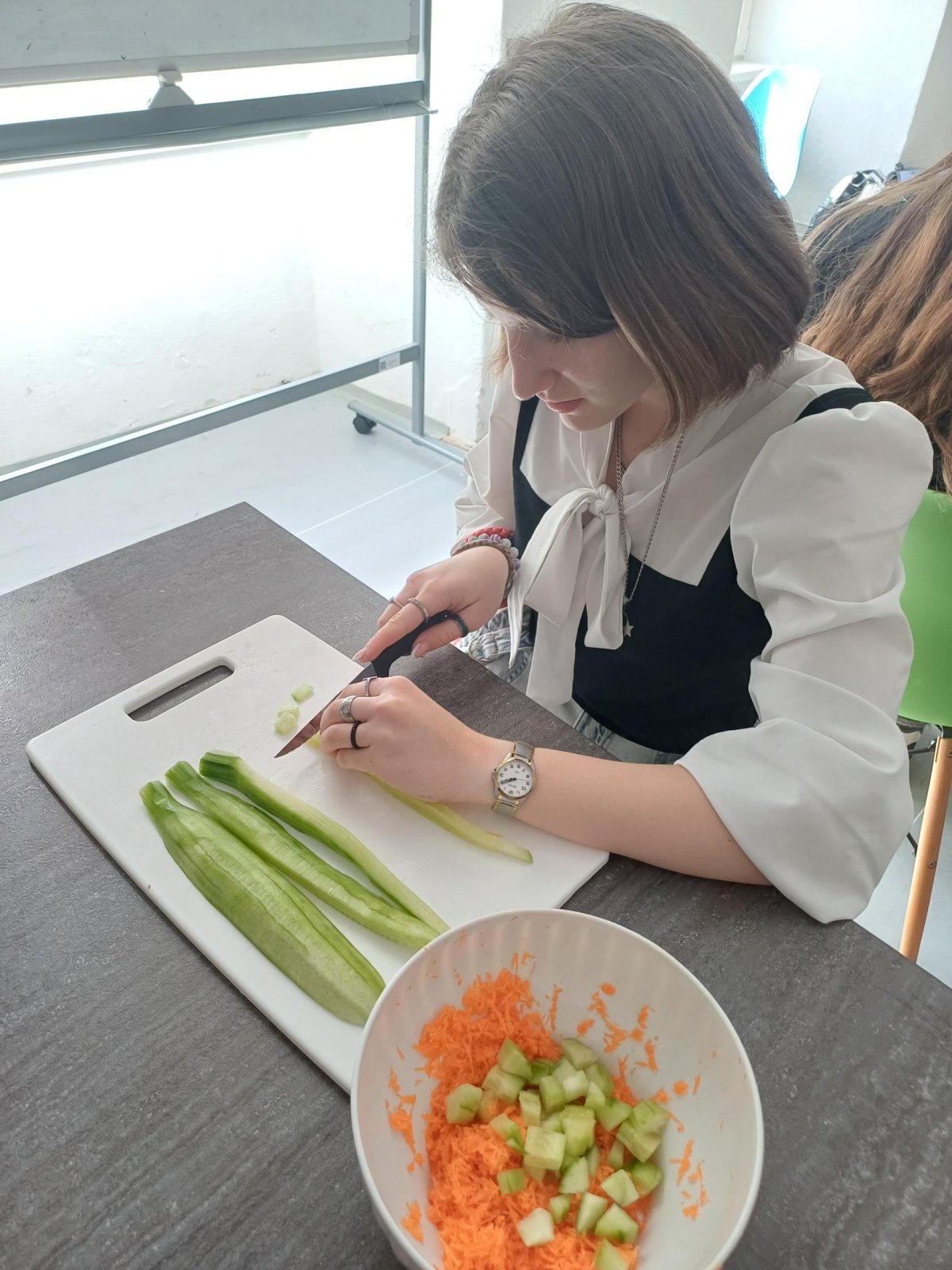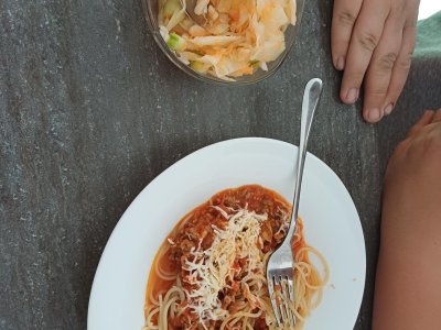 V pracovních činnostech jsme se vydali do kuchyňky a uvařili si italskou klasiku, boloňské špagety. K tomu jsme si udělali i zelný salát. A co jsme si uvařili, to jsme si i snědli.