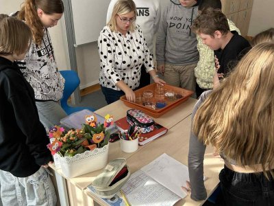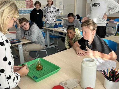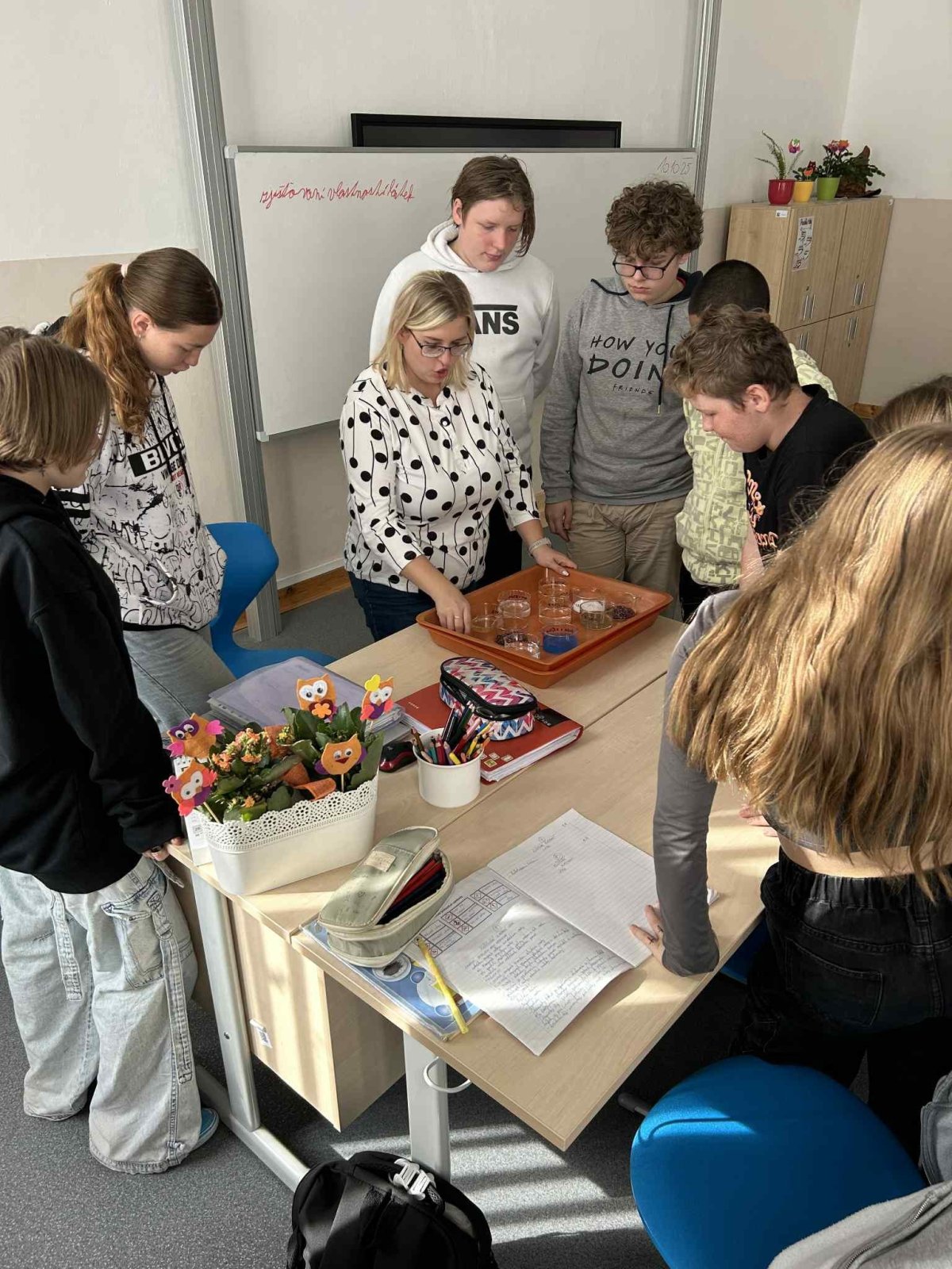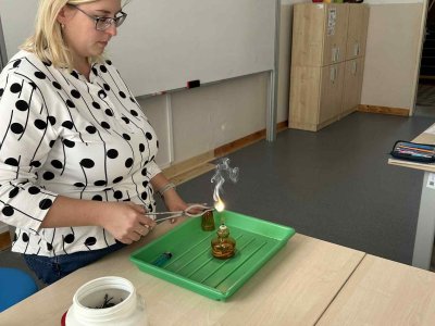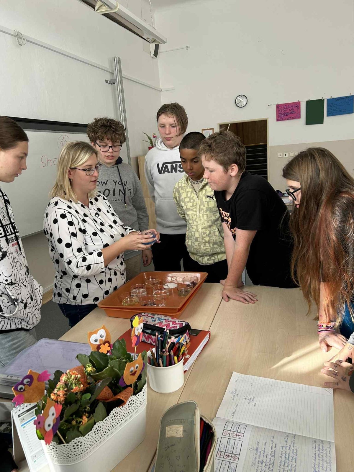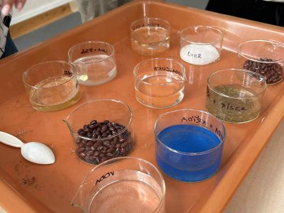 Paní učitelka nám při pokusu ukázala zajímavé vlastnosti různých látek. Bylo to zábavné a už se těšíme na další experimenty!