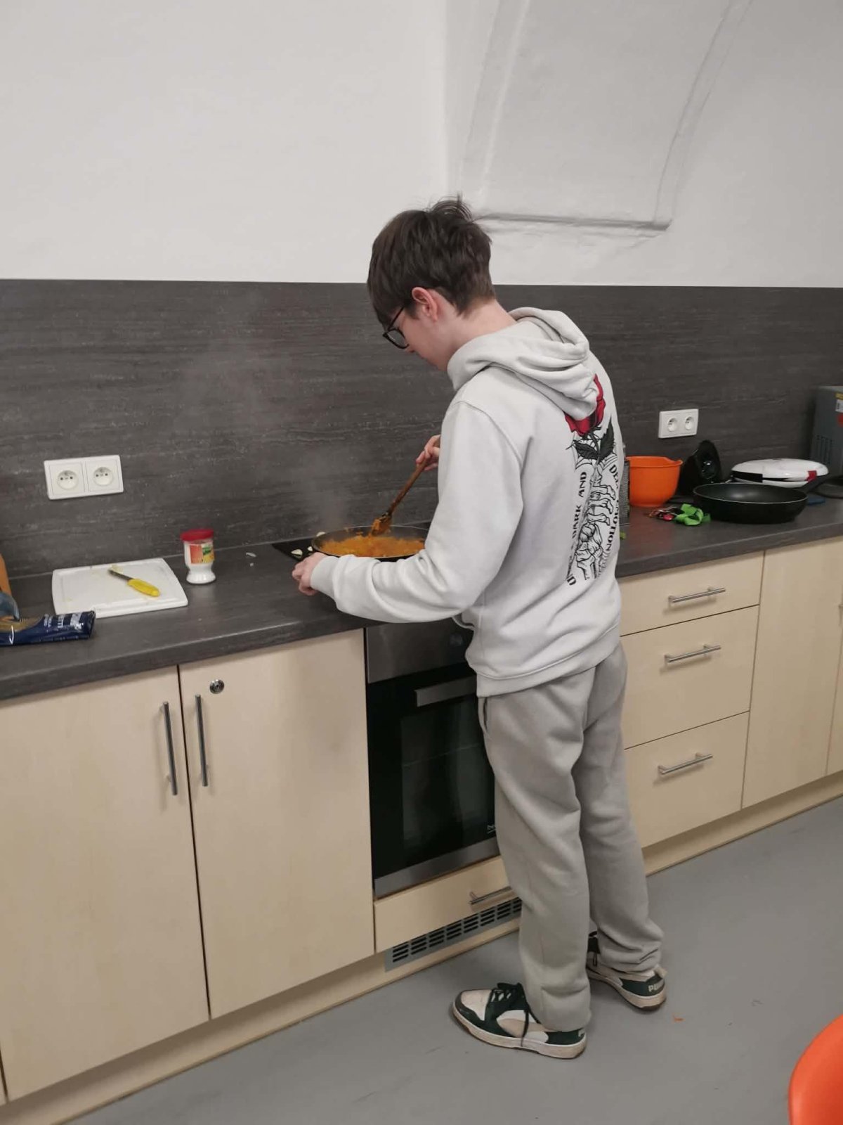 ... ale v kuchyni při vaření je teplo. A tak jsme i my zkusili ukuchtit něco lahodného. Tentokrát to byly špagety s restovanoou zeleninou - mrkev, řapíkatý celer, cibule, česnek, na tomatovém základě, sypané strouhaným parmezánem.