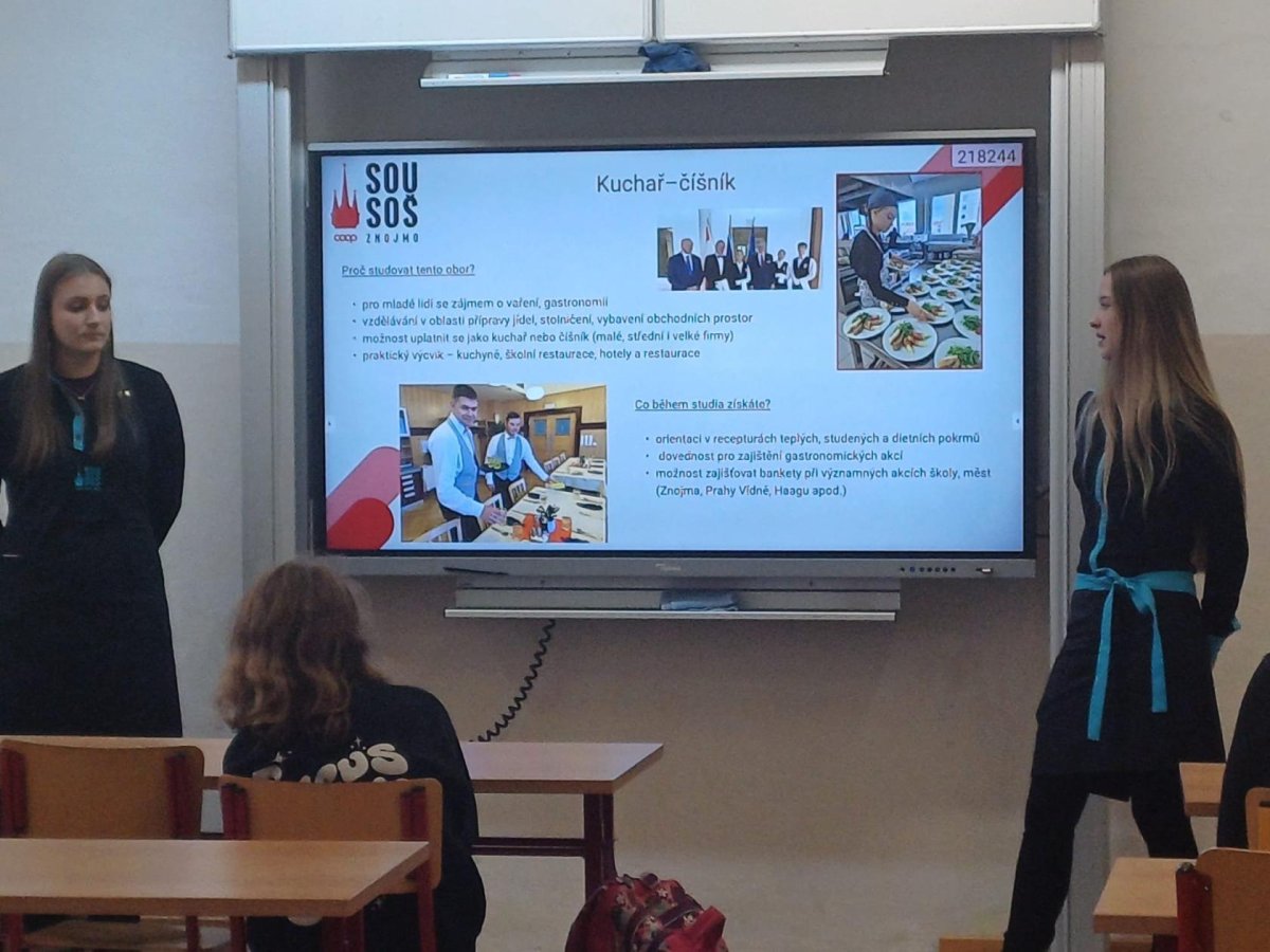 Žáci 9. ročníku měli v rámci volby povolání besedu se zástupci SOŠ a SOU Přímětická. Dvě studentky oboru hotelový management společně se svou paní učitelkou představily nabídku studijních oborů. Přiblížily, co jednotlivé obory obnášejí i jaké dovednosti si studenti během studia osvojí. Nyní před deváťáky stojí volba, kam jejich kroky po základní škole povedou dál.