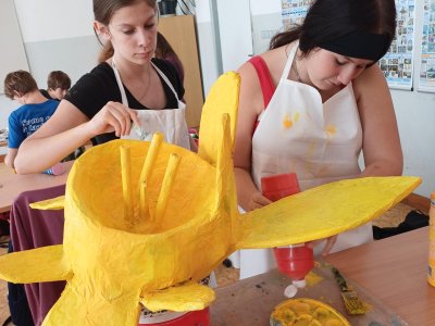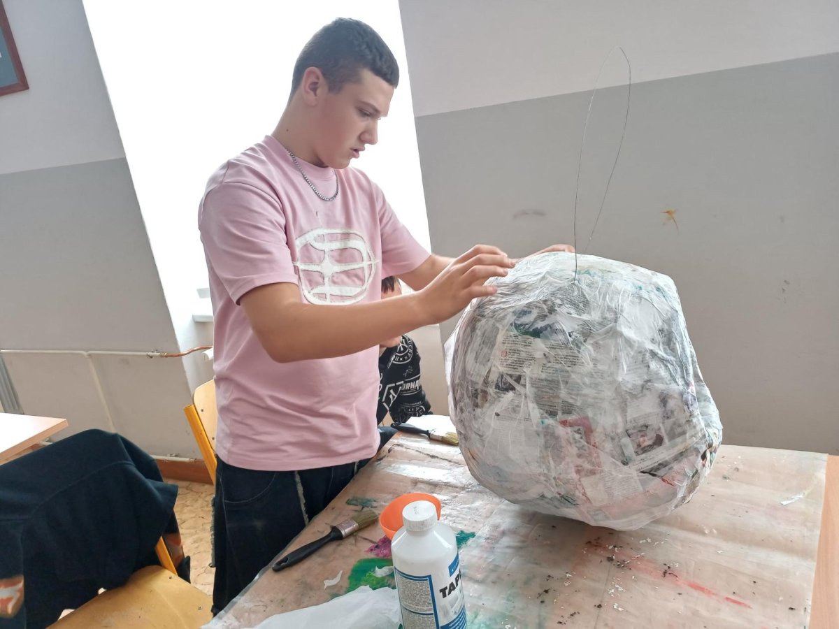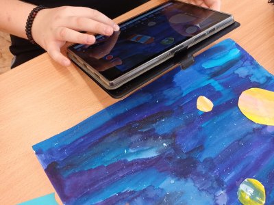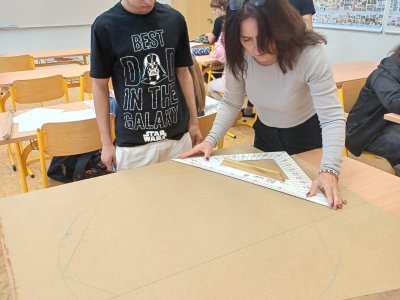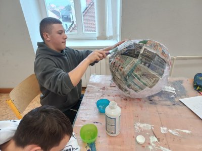 Ani deváťáci nezůstali pozadu – ve výtvarce také tvoříme na výstavu. Kreslíme, malujeme a zkoušíme různé nápady inspirované Star Wars nebo knihou Stopařův průvodce galaxií. Zkoušeli jsme i natočit video, které se sice úplně nepovedlo, ale ne vždy jde jen o výsledek. Přemýšleli jsme také nad tím, jak výtvarně zachytit život hvězdy.
