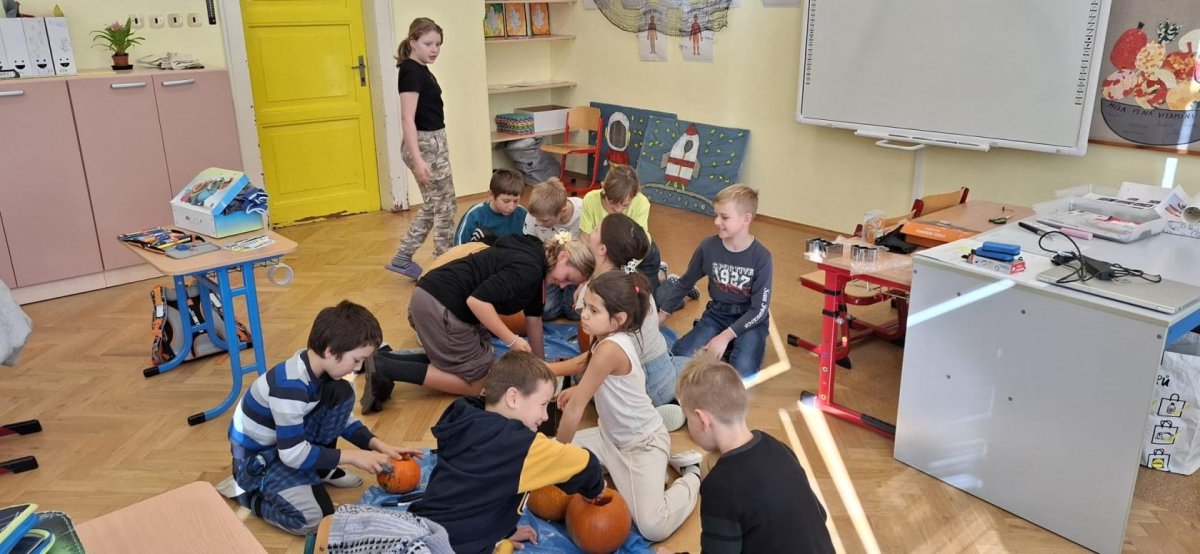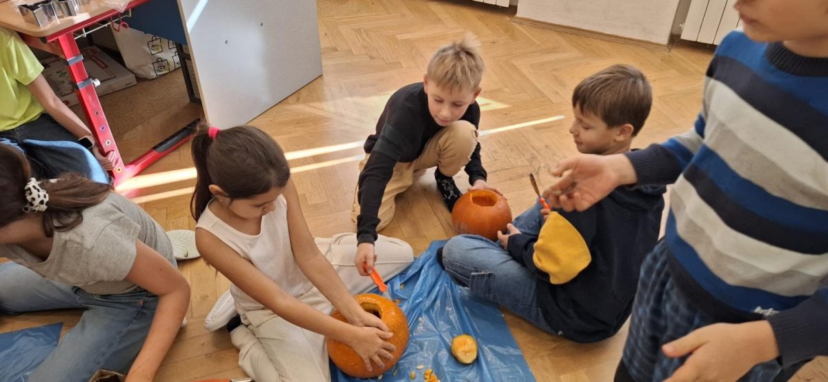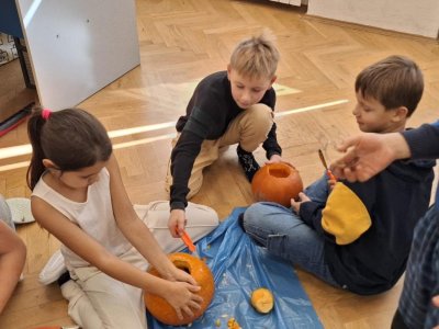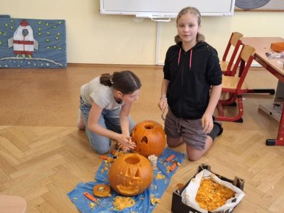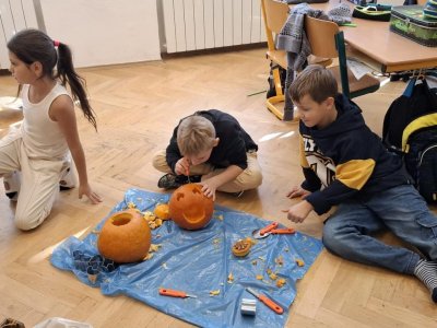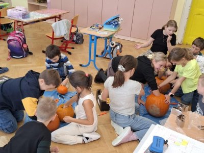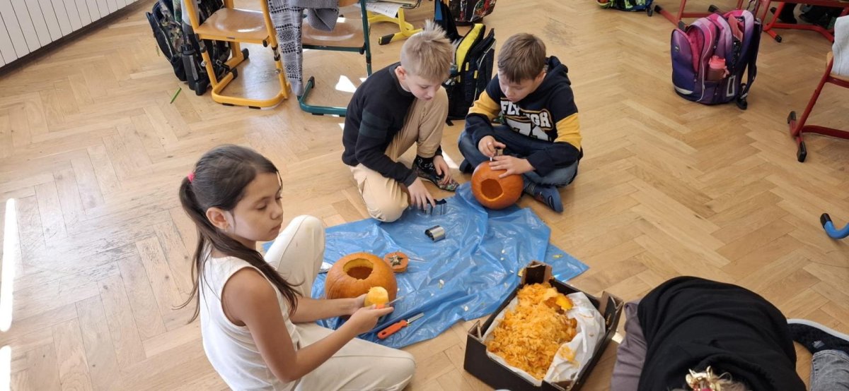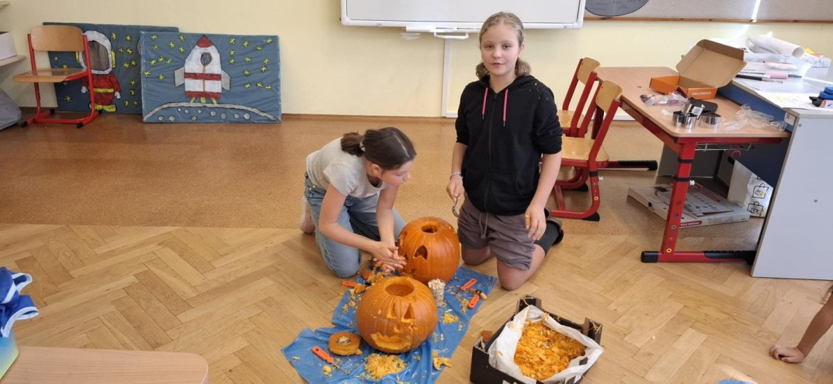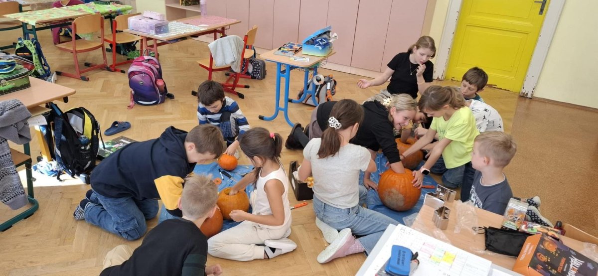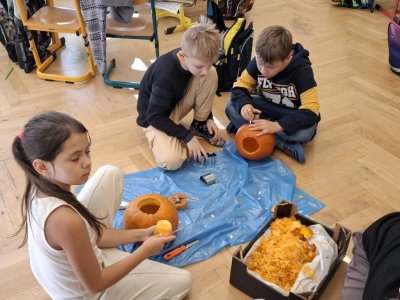 Na páteční výuku výtvarné výchovy se celá třída velmi těšila. A proč? Protože jsme se věnovali přípravě oslavy Halloweenu, která bude následovat příští týden v pátek, 31. 10. 2025. A co všechno jsme zvládli? Tak nejvíce se děti těšily na dlabání dýní, které jsme si předem opatřili. Vůbec to nebyla jednoduchá práce. Děti pracovaly s různými vykrajovátky, malými pilkami, noži a dalšími pomůckami. Fantazii se meze nekladou. Celou dobu jsem dohlížela na bezpečnost, aby se někdo nezranil.
