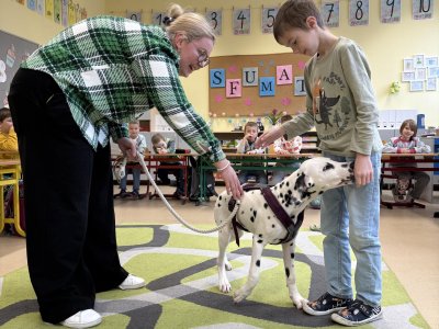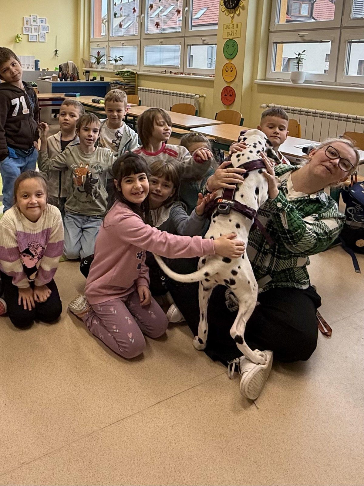 Eda je boží štěňátko milující děti a je pro každou legraci. Ve třídě se okamžitě zabydlel. Děti si ho mohly pohladit, nakrmit a taky se zeptat na všechno, co je o psím životě zajímalo. Takže už například víme, že Eda má rád meloun a na tajňačku upíjí kafe s mlíkem :-) Tatínka má z Norska a bráška bydlí na Slovensku. Kdo ví, kam vezme na prázdniny Eda paní učitelku?!