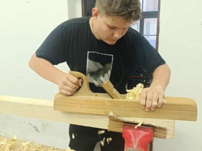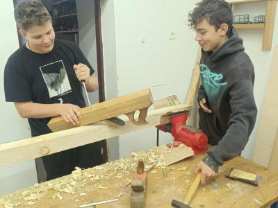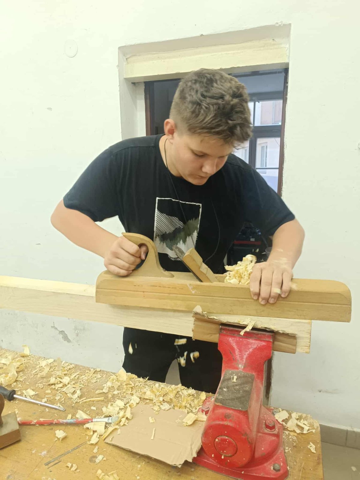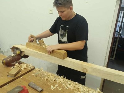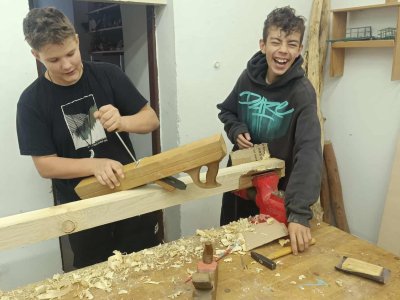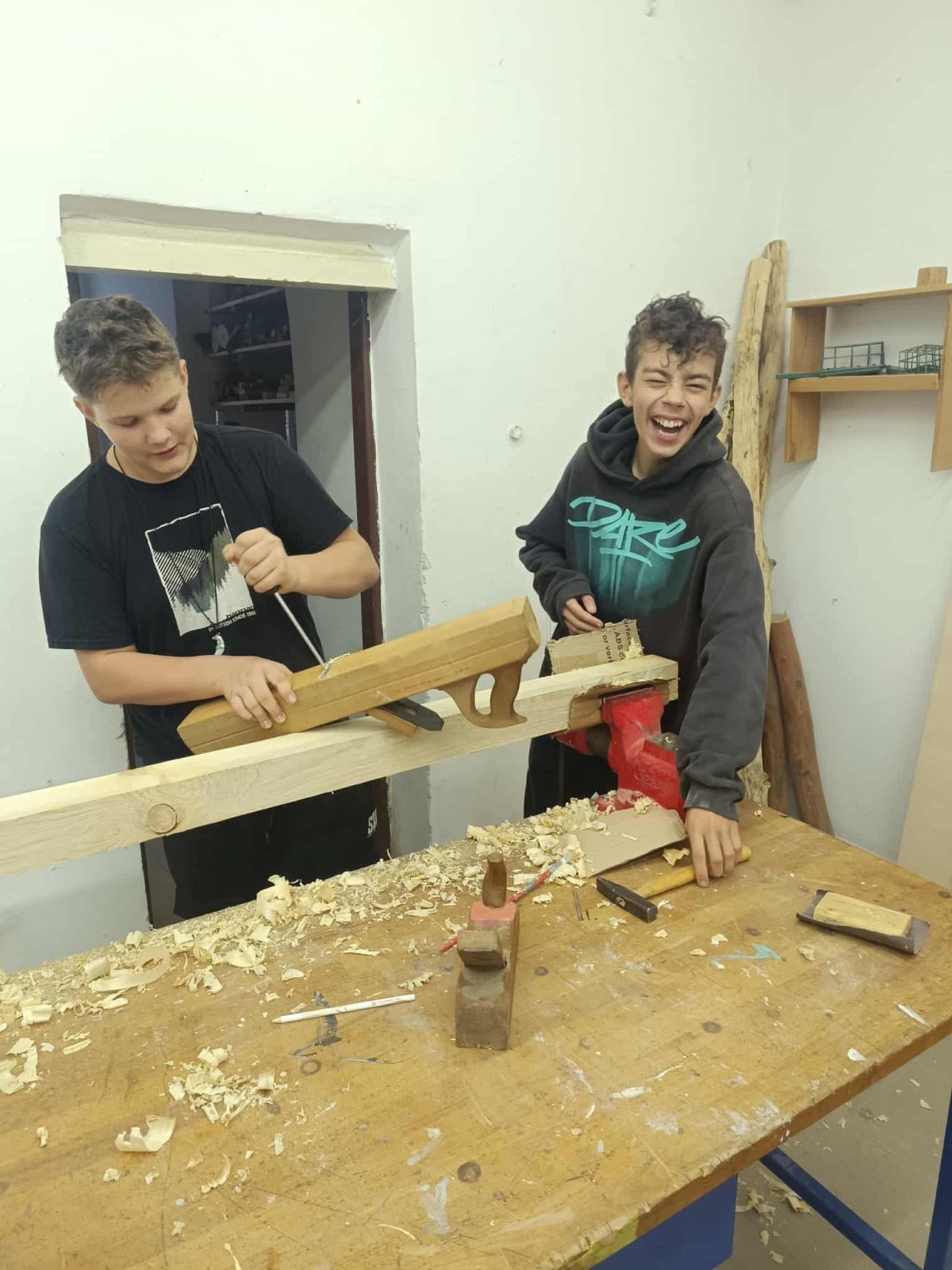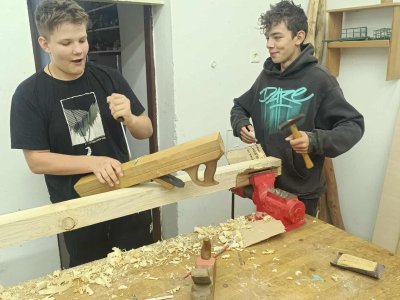 Už jsme osmáci a chceme zkusit něco pořádného s dospěláckým nářadím. Jsme tedy moc rádi, když můžeme vzít do ruky hoblík a pořádně se do něj opřít. Výsledek je sice nejistý, ale vždyť se to teprve učíme. Jednou budeme skvělí řemeslníci.
