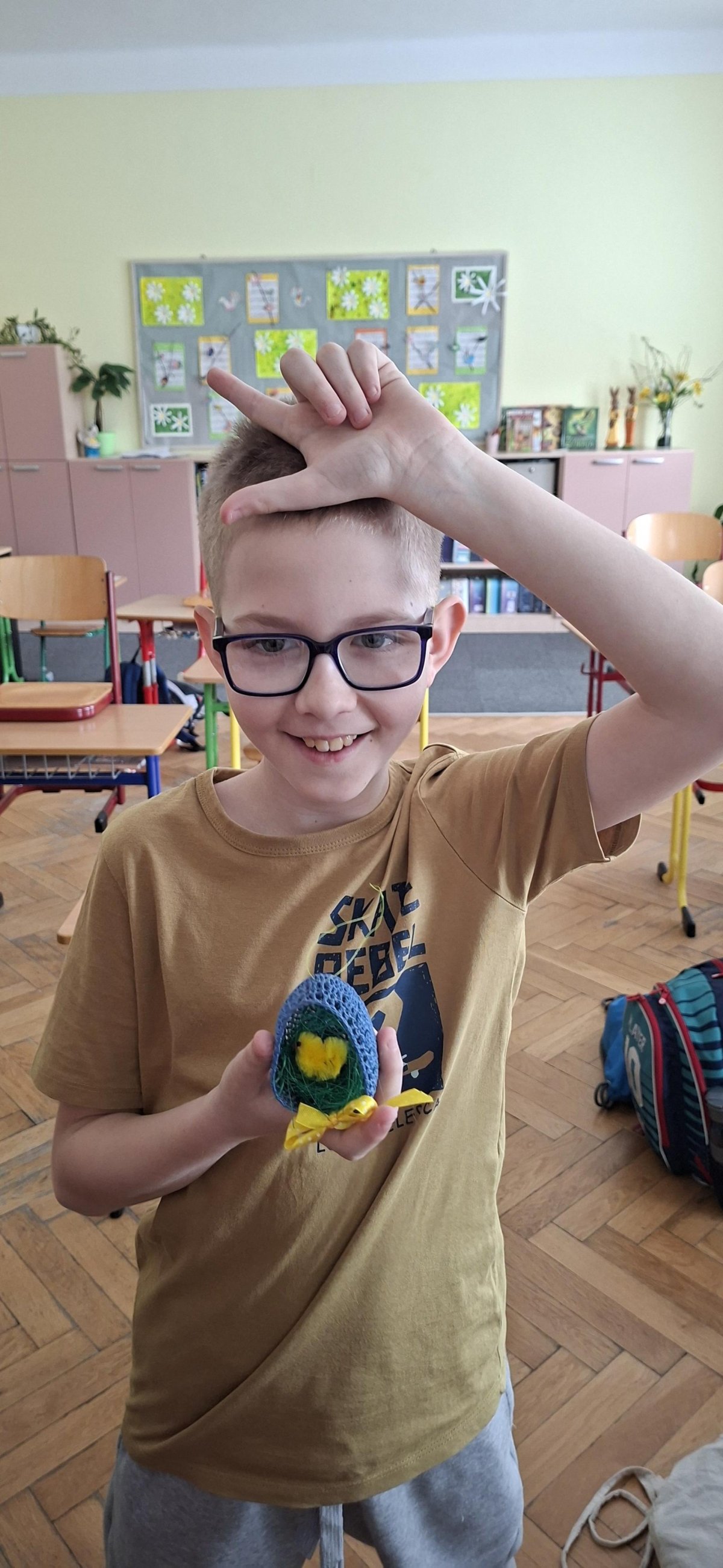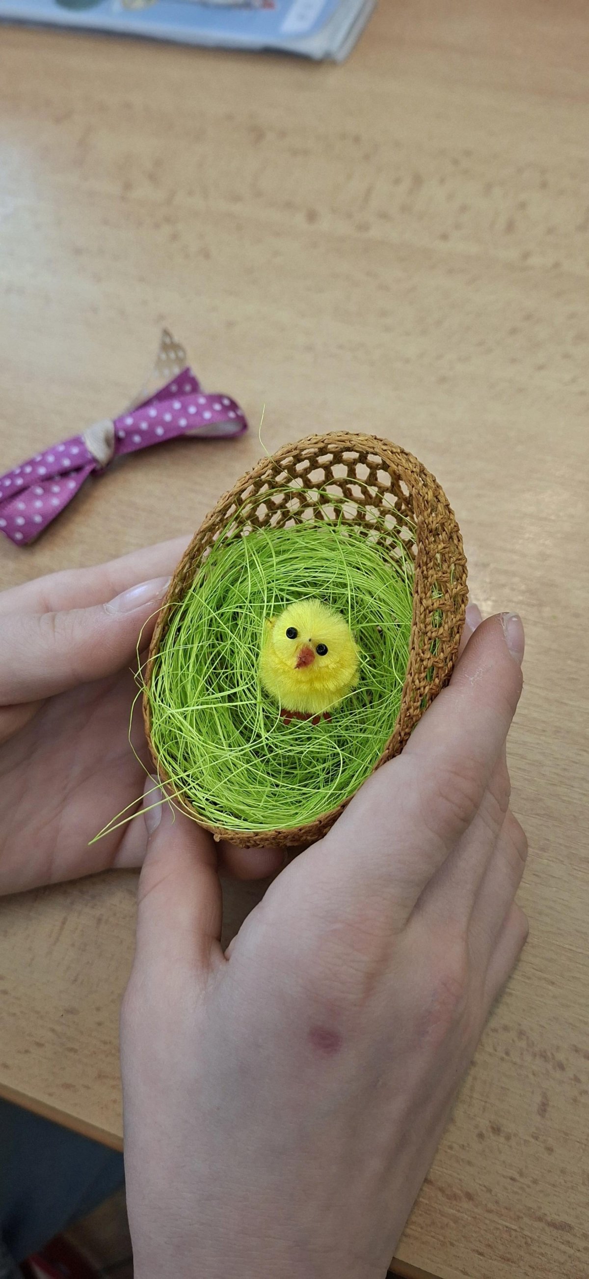 Vajíčka v Alšovce nebyla jediná, která si naši čtvrťáci odnesli domů. V pracovních činnostech si vyrobili ještě jednou závěsnou dekoraci - do háčkovaných vajíček posadili na travnaté hnízdo malé kuřátko a výrpoběk si dozdobili mašličkou. Pojďte si je s námi prohlédnout.